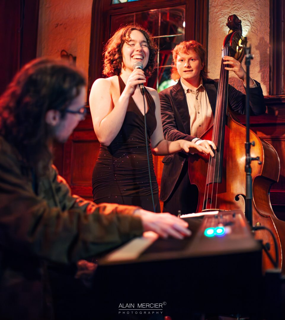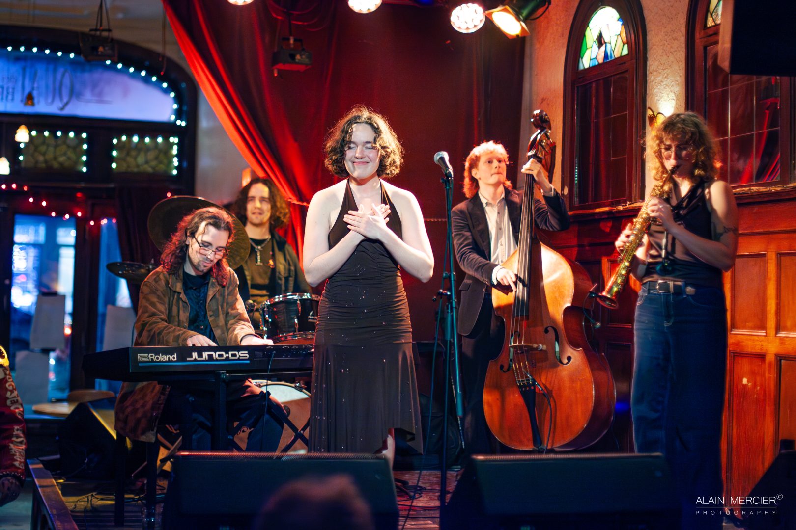 Dès les premiers battements de batterie, aussi imposants que la stature de Matys Colpron, l’ouverture s’impose. Il accueille Charlotte dans un dialogue de scats jazz, sa voix jouant avec la sienne comme un écho complice. De cette rencontre naît une relecture sensible de Pour un flirt de Michel Delpech. Le pianiste Sam Fortin, le contrebassiste Sam Ripat et la saxophoniste Maude Fortier complètent la scène, offrant ensuite une interprétation habitée de En pleine face du groupe Harmonium.