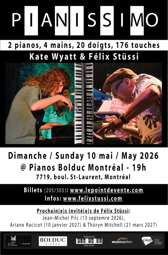 La sublime série Pianissimo de Félix Stüssi se poursuit avec la formidable pianiste Kate Wyatt dimanche le 10 mai @ Pianos Bolduc. Le concept est simple : chaque participant(e) propose quatre compositions ou arrangements, on répète l’après-midi et on joue le même soir. Ainsi, chaque rencontre devient une aventure musicale spontanée, pleine de surprises et d’improvisations.
